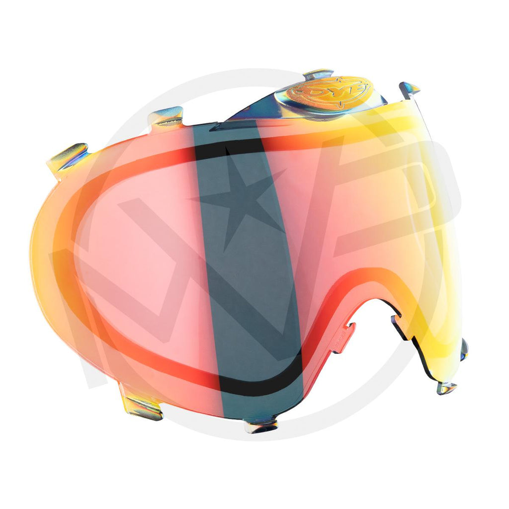 Impact-resistant construction designed to withstand aggressive play and meet the demands of competitive paintball. LENS TINT SPECIFICATIONS: Smoke Dark neutral tint. Best suited for bright to mixed light conditions. Designed to reduce overall light transmission while maintaining natural color accuracy. Smoke Silver Mirrored neutral tint. Best suited for intense bright to mixed light conditions. Designed to minimize glare and reflective light in high-sun environments. Chameleon Multi-mirror tint. Best suited for bright to mixed light conditions. Designed to balance glare control with enhanced contrast as lighting shifts. Bronze Fire Warm mirrored tint. Best suited for bright to variable light conditions. Designed to improve contrast and depth perception under strong sunlight. North Fire Balanced contrast tint. Best suited for mixed light conditions. Designed to enhance detail and visual clarity under variable sun and cloud cover. Blue Ice Cool mirrored tint. Best suited for bright to mixed light conditions. Designed to reduce glare while maintaining sharp visual separation. HD Burnt Yellow High-contrast tint. Designed to increase definition and visibility in mixed light conditions. HD Enhanced contrast tint. Best suited for variable mixed to low light conditions. Designed to improve depth perception and field detail. Yellow Low-light contrast tint. Best suited for overcast or low-light conditions. Designed to amplify brightness and visual contrast in reduced light. Clear Untinted lens. Best suited for very low-light or indoor conditions. Designed to provide maximum light transmission with true color clarity. LENS SAFETY NOTICE: With the release of the new DYE i3 Pro, it’s important to note that older-generation i3 lenses should NOT be reused. Lenses from earlier i3 models no longer meet current safety standards and can pose a serious risk if installed in a modern goggle system.